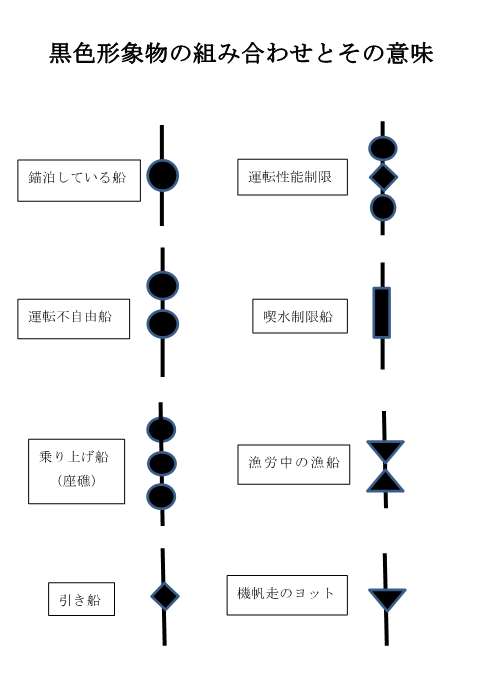 - エンジンや舵の故障で潮や風に流され運転不自由船になると黒球2個掲げる。